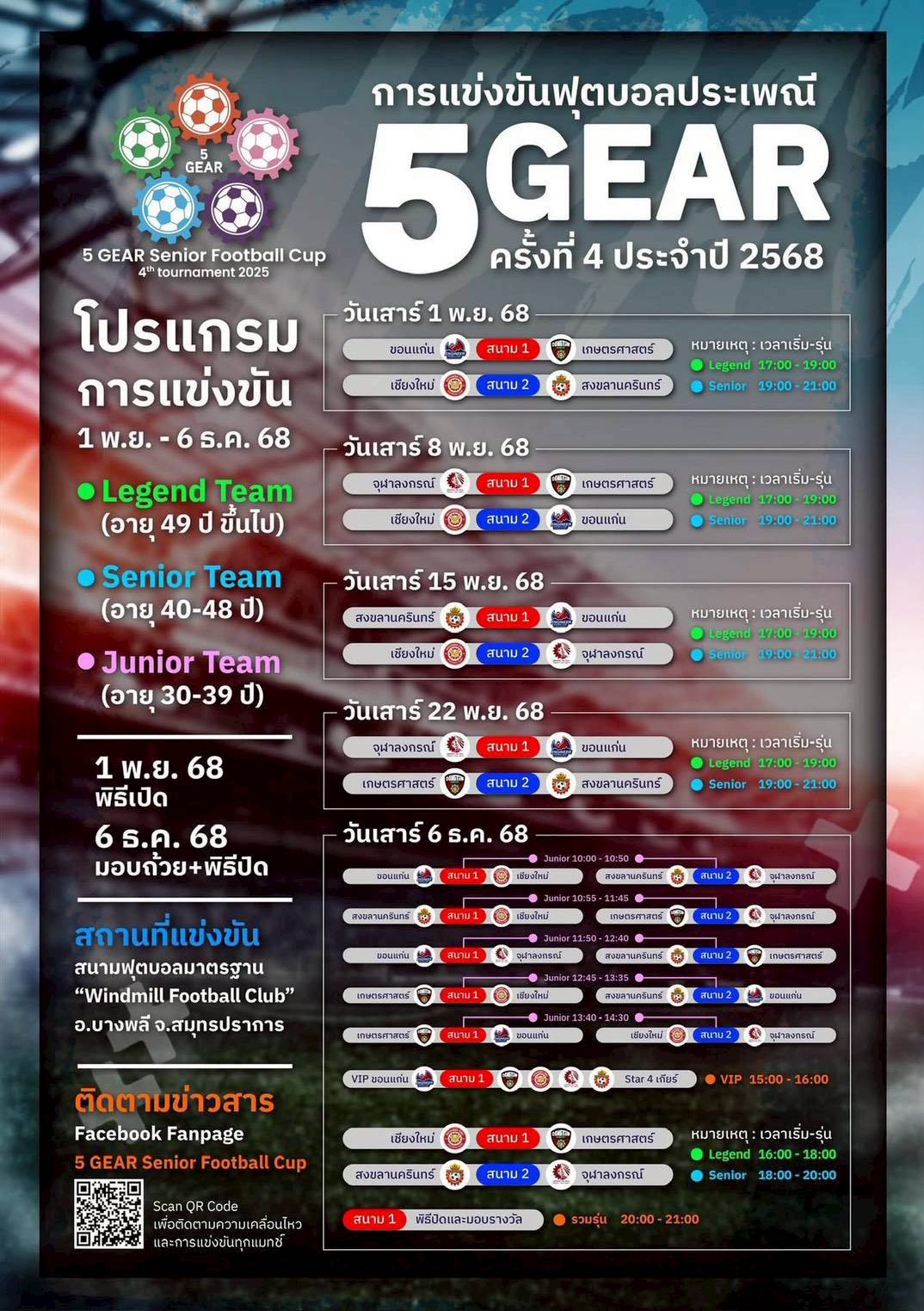 เสาร์ที่ 1 พ.ย. 2568 ที่จะถึงนี้ จะมีการแข่งขันฟุตบอลประเพณี 5 เกียร์ ครั้งที่ 4