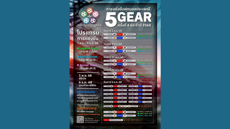 เสาร์ที่ 1 พ.ย. 2568 ที่จะถึงนี้ จะมีการแข่งขันฟุตบอลประเพณี 5 เกียร์ ครั้งที่ 4
