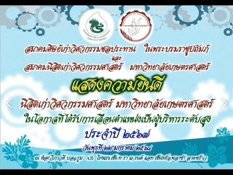 พิธีมอบโล่นิสิตเก่าดีเด่น ประจำปี2568 จัดโดย นายกสมาคมนิสิตเก่ามหาวิทยาลัยเกษตรศาสตร์ ในพระบรมราชูปถัมป์ เมื่อวันอาทิตย์ที่ 2 กุมภาพันธ์ 25668 ณ ห้องประชุมมหาวิทยาลัยเกษตรศาสตร์.